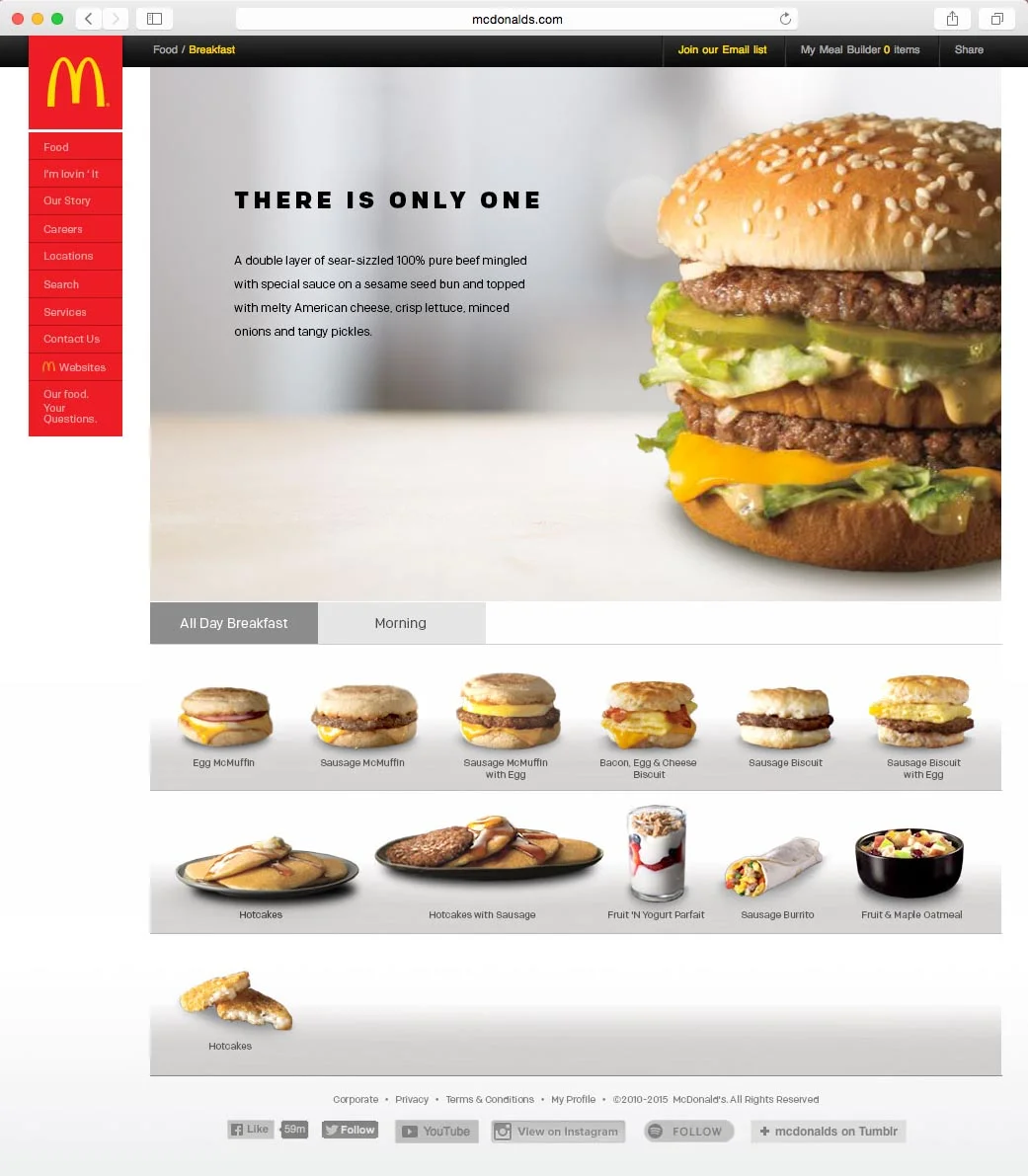 When McDonald's launched their widely heralded All Day Breakfast program, they also quietly re-photographed all of their food in a more naturalistic style. The mission of this little website redesign was to incorporate the new photography into an existing CSS shell.
